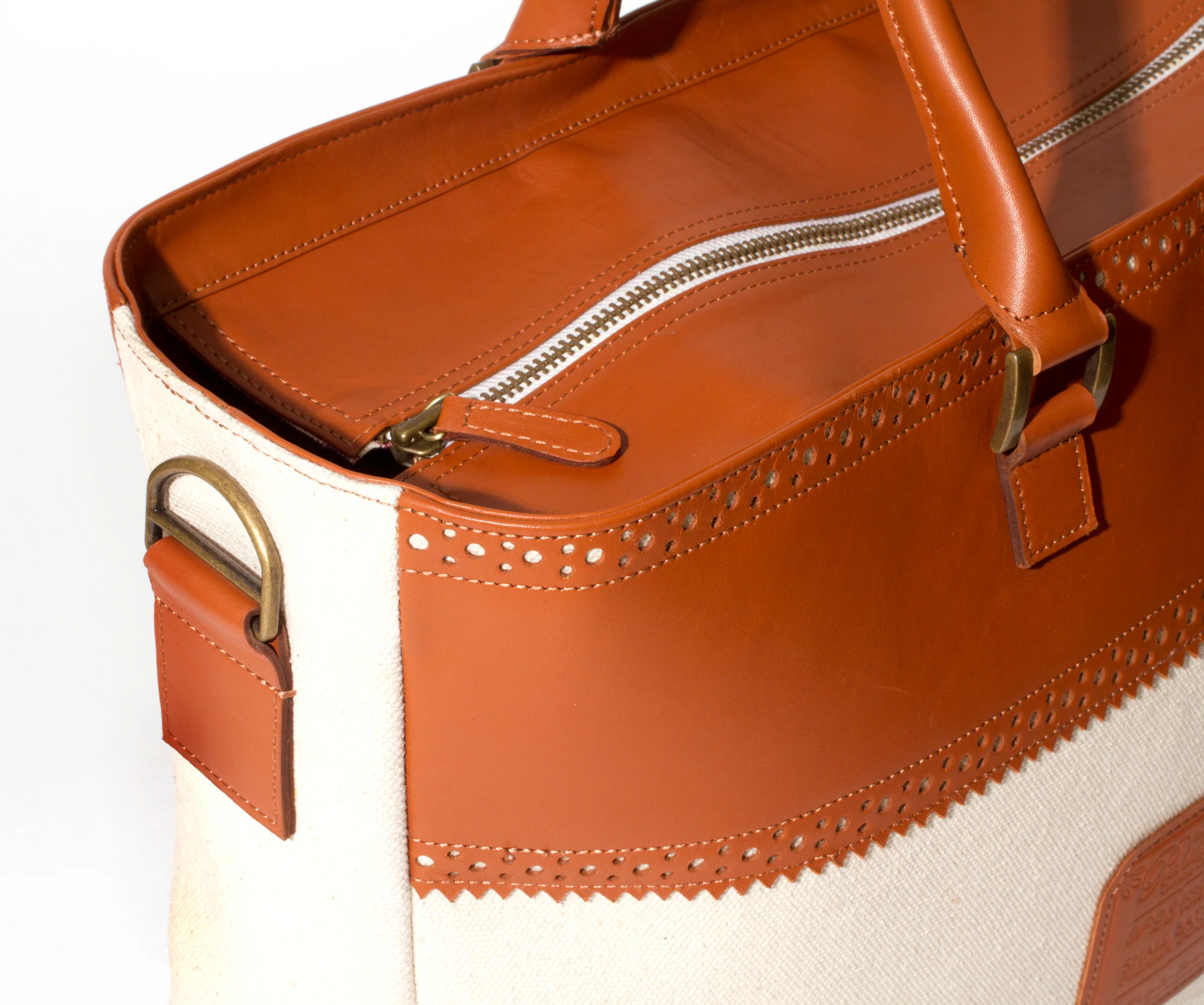 Here's a bag that covers all bases. It's light, durable, well-built and features the classic spectator detailing that is the associated with fine menswear. We started with a spacious tote and reduced the weight by making it in a sturdy cotton canvas that is almost indestructible and is stain resistant. We added liberal amounts of punched and pinked spectator details to ensure the styling was first class. Next we added a leather bottom with solid brass feet for durability and protection.
